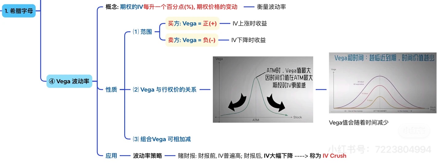 Greeks 总纲,说明 Vega 是理解期权价格波动来源的关键变量之一; Vega 主图,强调“IV 每变化 1 个百分点,期权价格会如何变化”、Vega 在 ATM 附近更大、到期越近 Vega 往往越小,以及财报后的 IV Crush。 如果你只记一句话,那就是: